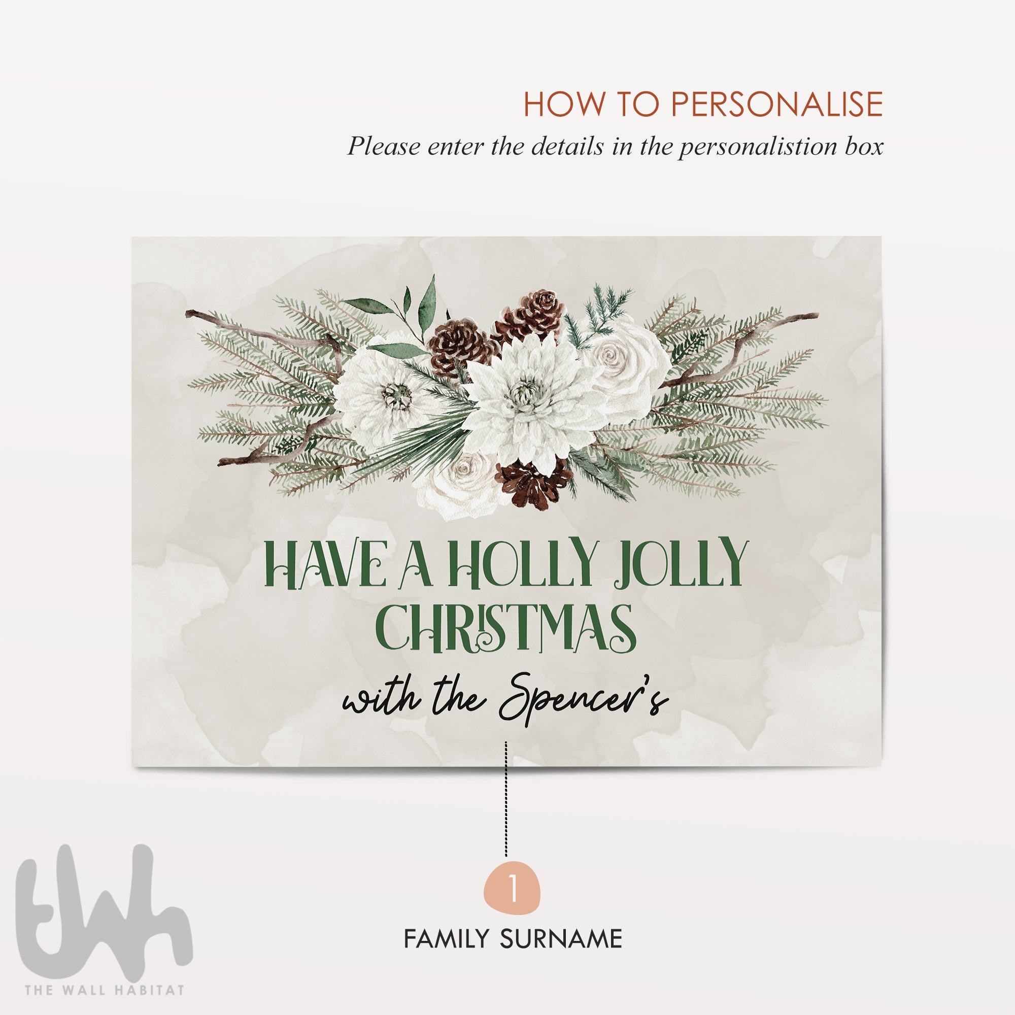 Create a warm and festive welcome with our Personalised Have a Holly Jolly Christmas wall art. Featuring elegant green typography, rustic woodland florals, winter greenery, pinecones and soft watercolour textures, this custom holiday print adds a beautiful farmhouse charm to any home.