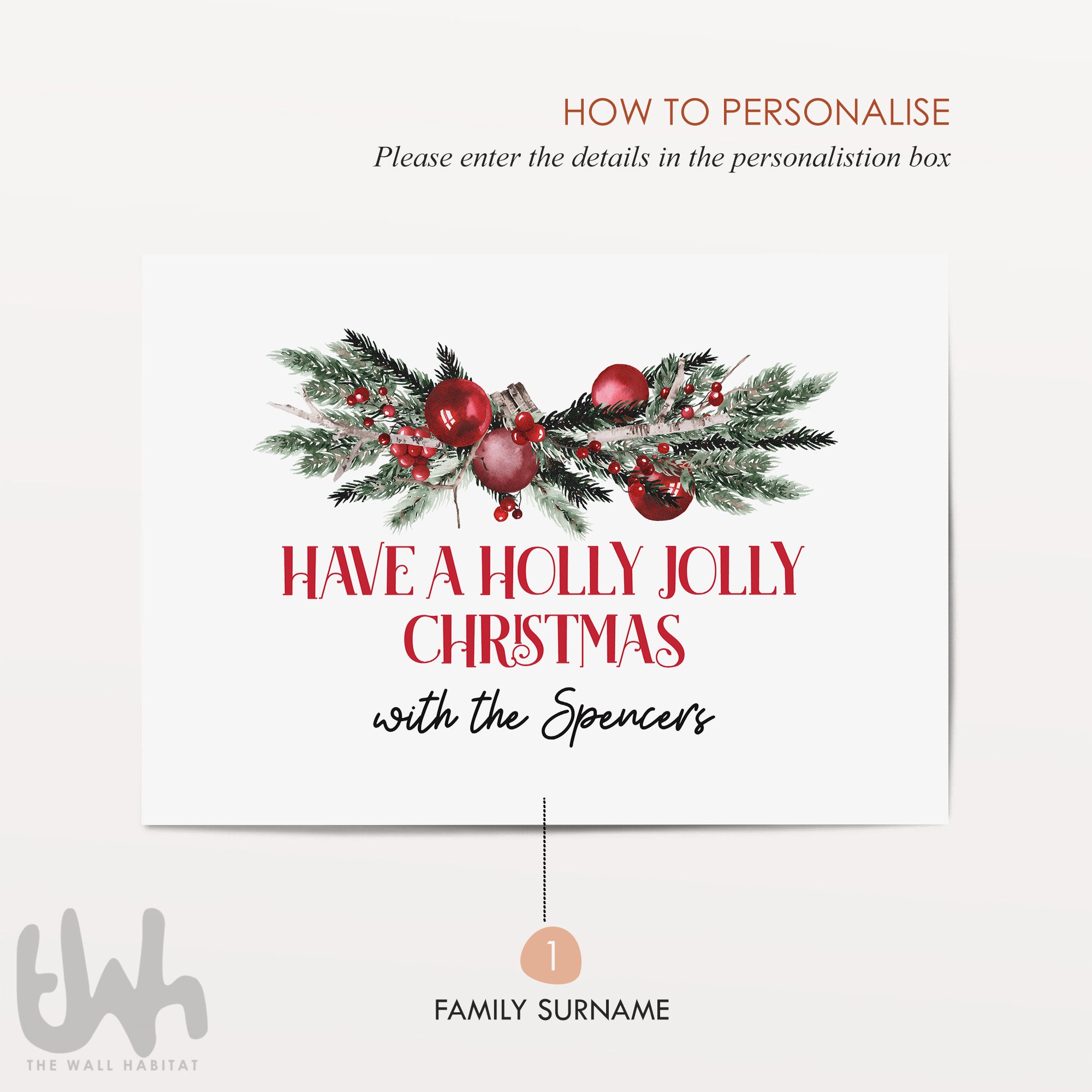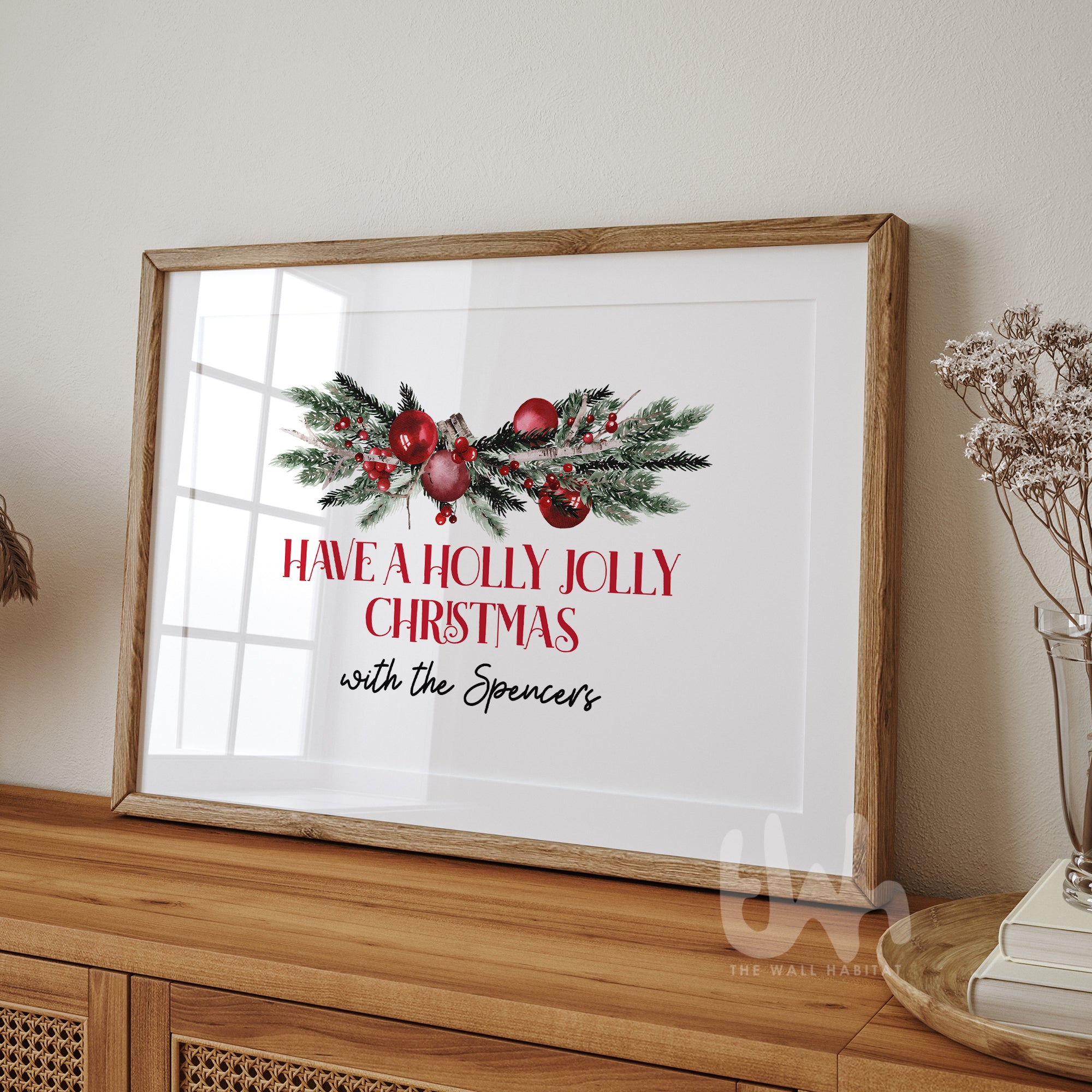 Personalised Holly Jolly Christmas Sign – Custom Family Name Holiday Wall Art – Rustic Christmas Home Decor Print