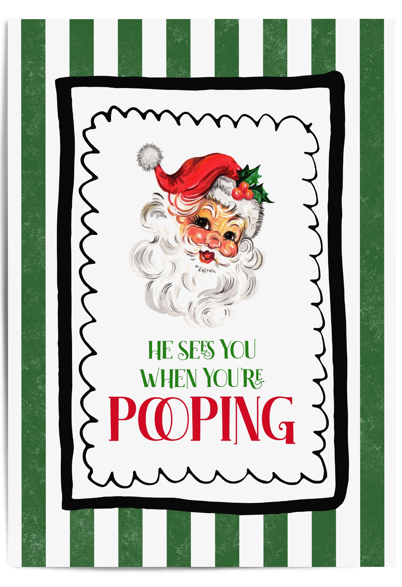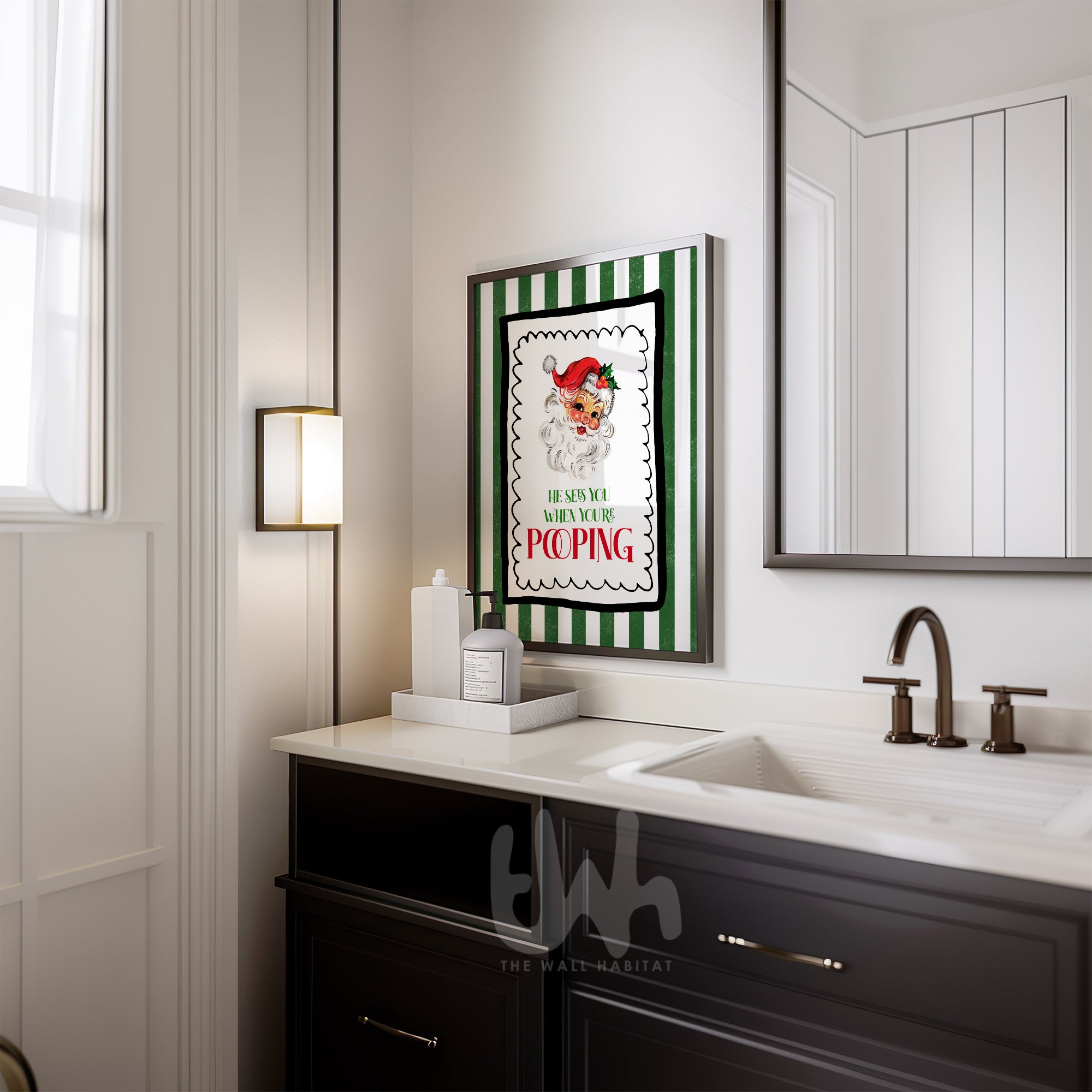 Funny Christmas Bathroom Wall Art – Retro Santa “He Sees You When You’re Pooping” Print | Humorous Holiday Decor | Green Striped Santa Poster