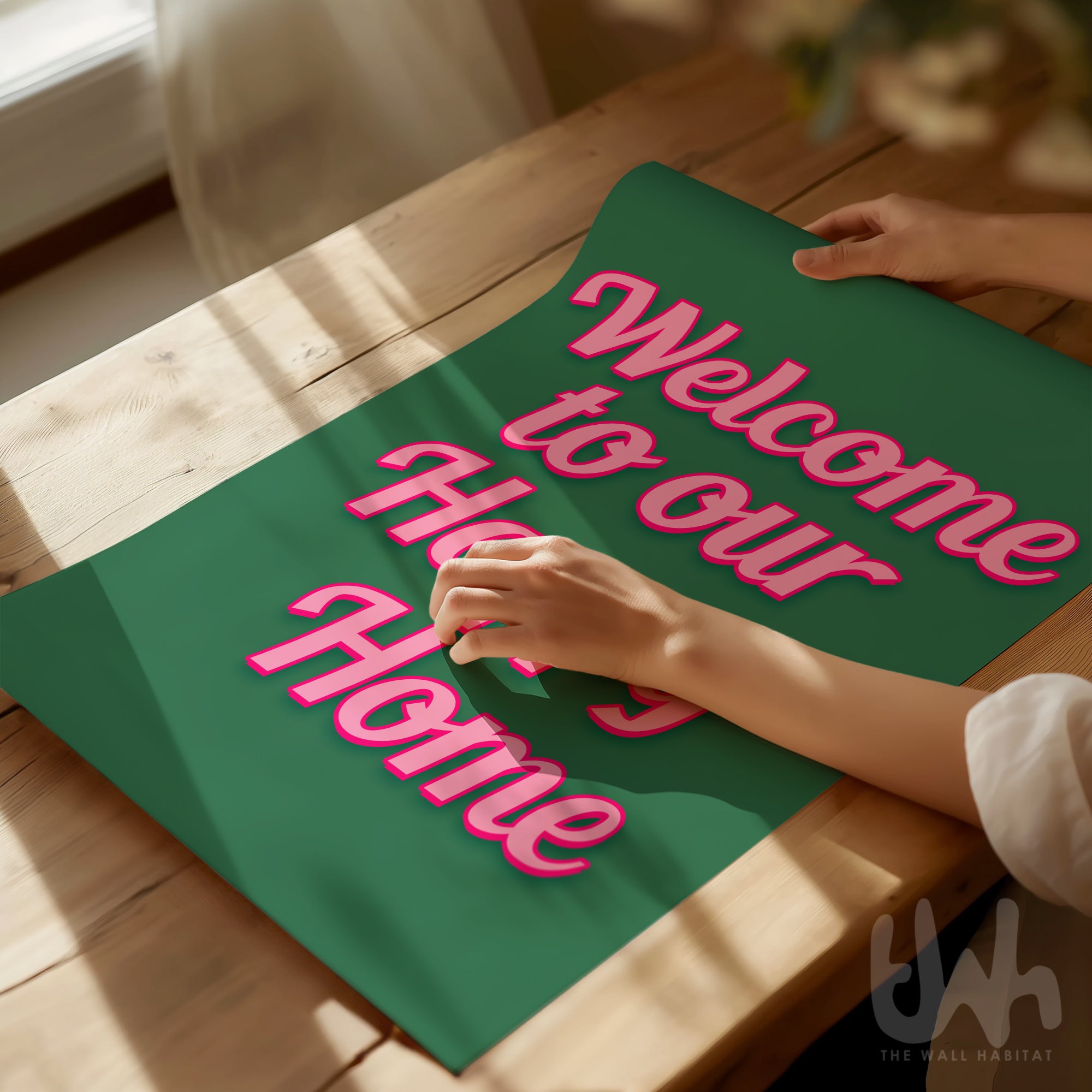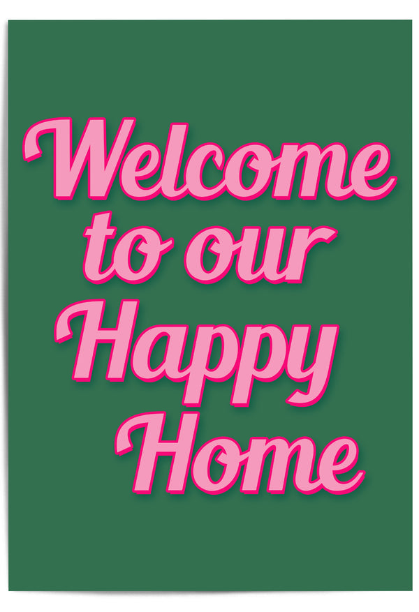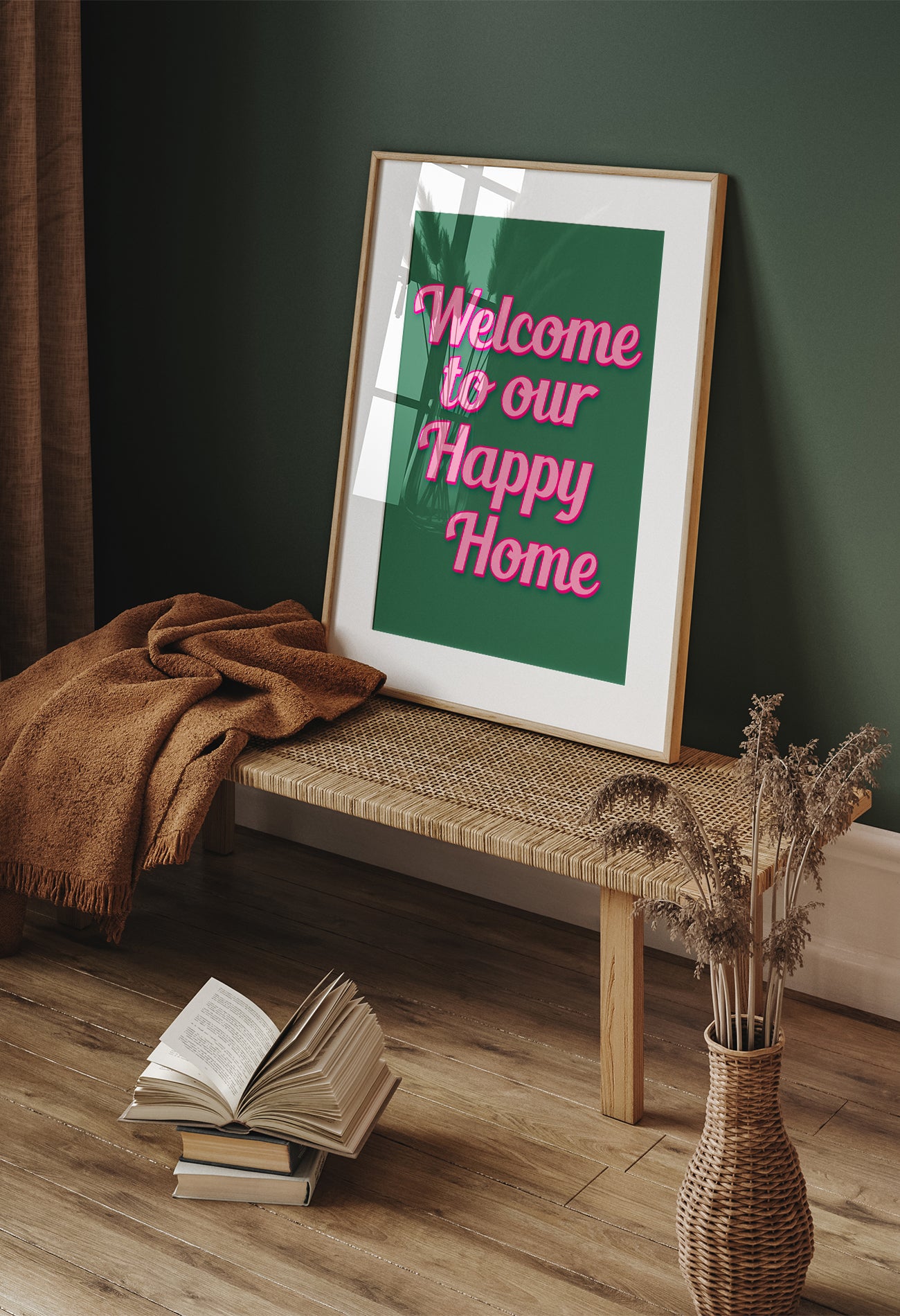 Bold wall art print with pink retro-style text reading 'Welcome to Our Happy Home' on a green background – perfect for cheerful home décor