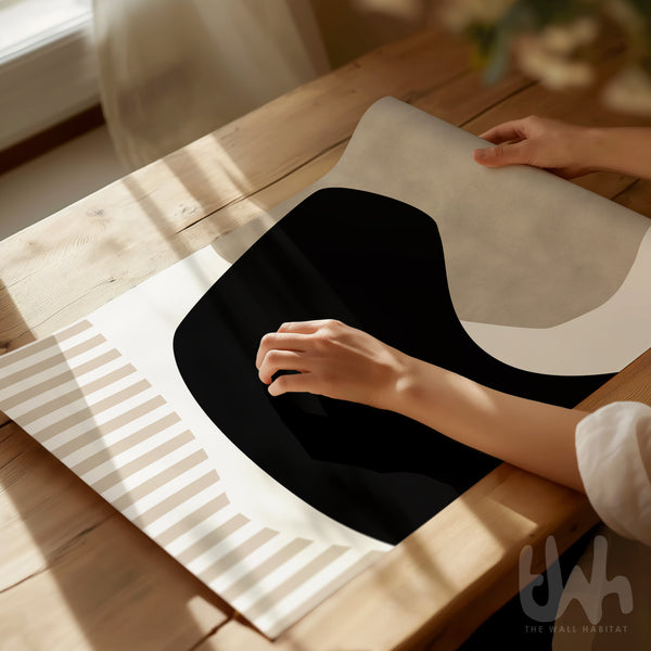 Add a touch of sophisticated minimalism to your home with this modern abstract wall art print. Designed with bold black curves, calming beige tones, and soft stripe detail, this piece is a perfect blend of form and harmony. Its neutral palette makes it easy to style in any modern, Scandinavian, or boho-inspired space. Whether displayed in your living room, hallway, or bedroom, this artwork delivers instant impact while maintaining a serene visual appeal.